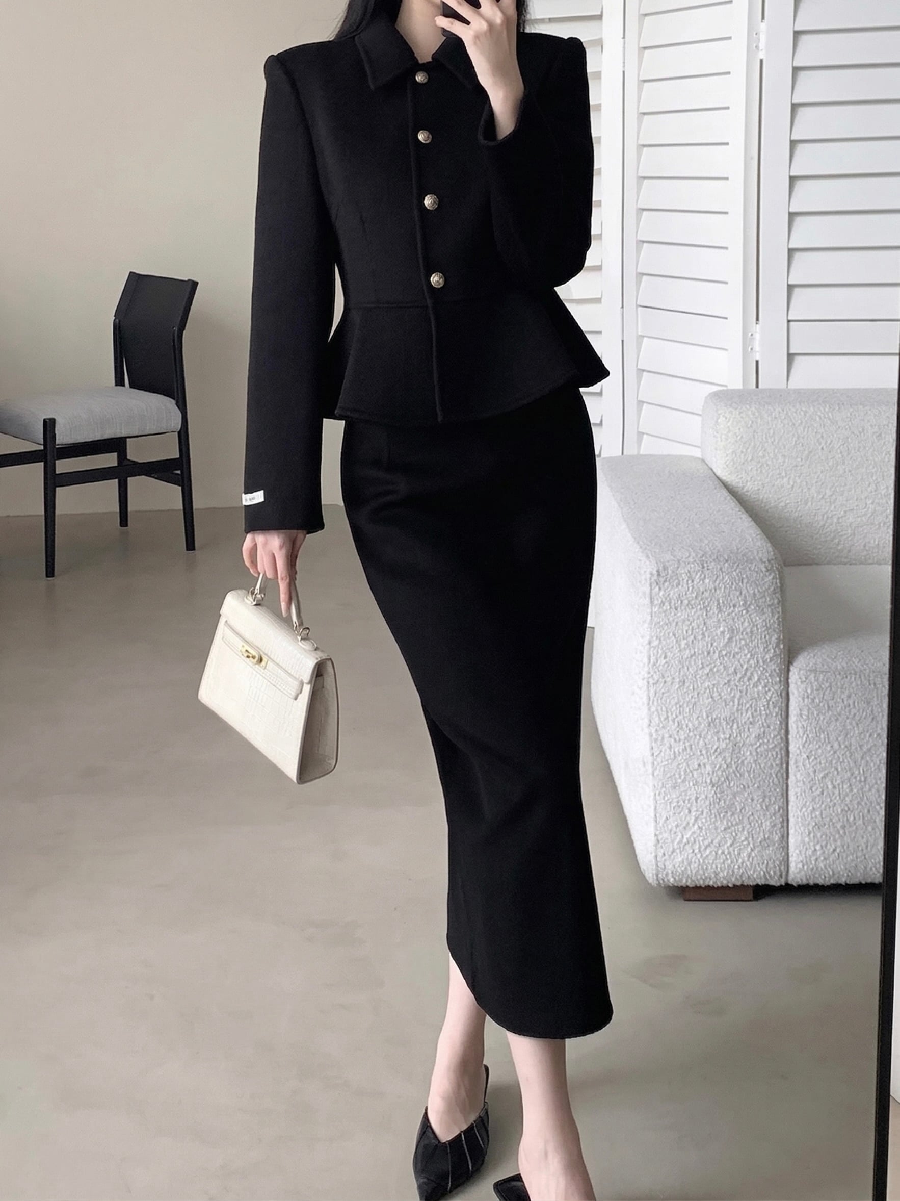 時を超えて愛されるクラシカルな美しさを、現代的に昇華させたラグジュアリーセットアップ。 ジャケットはウエストを美しく絞ったペプラムシルエットに、ゴールドボタンを配し、上品さと華やかさを兼ね備えています。 タイトスカートは縦のラインを強調し、スタイルアップ効果を演出。 ビジネスシーンから特別なディナーまで、幅広いシーンで活躍する一着です。 それぞれ単品でも着回し可能で、コーディネートの幅が広がります。 size:S 着丈50.5cm バスト92cm 肩幅42cm 袖丈58.5cm スカート丈84cm ウエスト66cm ヒップ91cm size:M 着丈51.7cm バスト96cm 肩幅43cm 袖丈59.5cm スカート丈85cm ウエスト70cm ヒップ95cm size:L 着丈52.9cm バスト100cm 肩幅44cm 袖丈60.5cm スカート丈86cm ウエスト74cm ヒップ99cm 生地成分:ウール100% ◾︎ 配送期間 約10〜21営業日お時間を頂戴しております。(土日・祝日を除く) ◾︎ 公式LINEお友達追加で¥1,000 OFFクーポンプレゼント https://lin.ee/F5Jw76G ◾︎ 必ず下記ページの「ご利用ガイド」をお読みの上 ご購入をお願いいたします。 https://riristore.official.ec/about