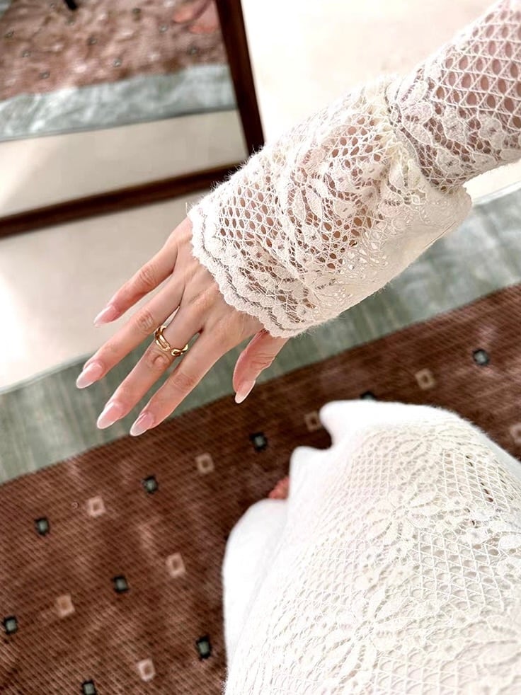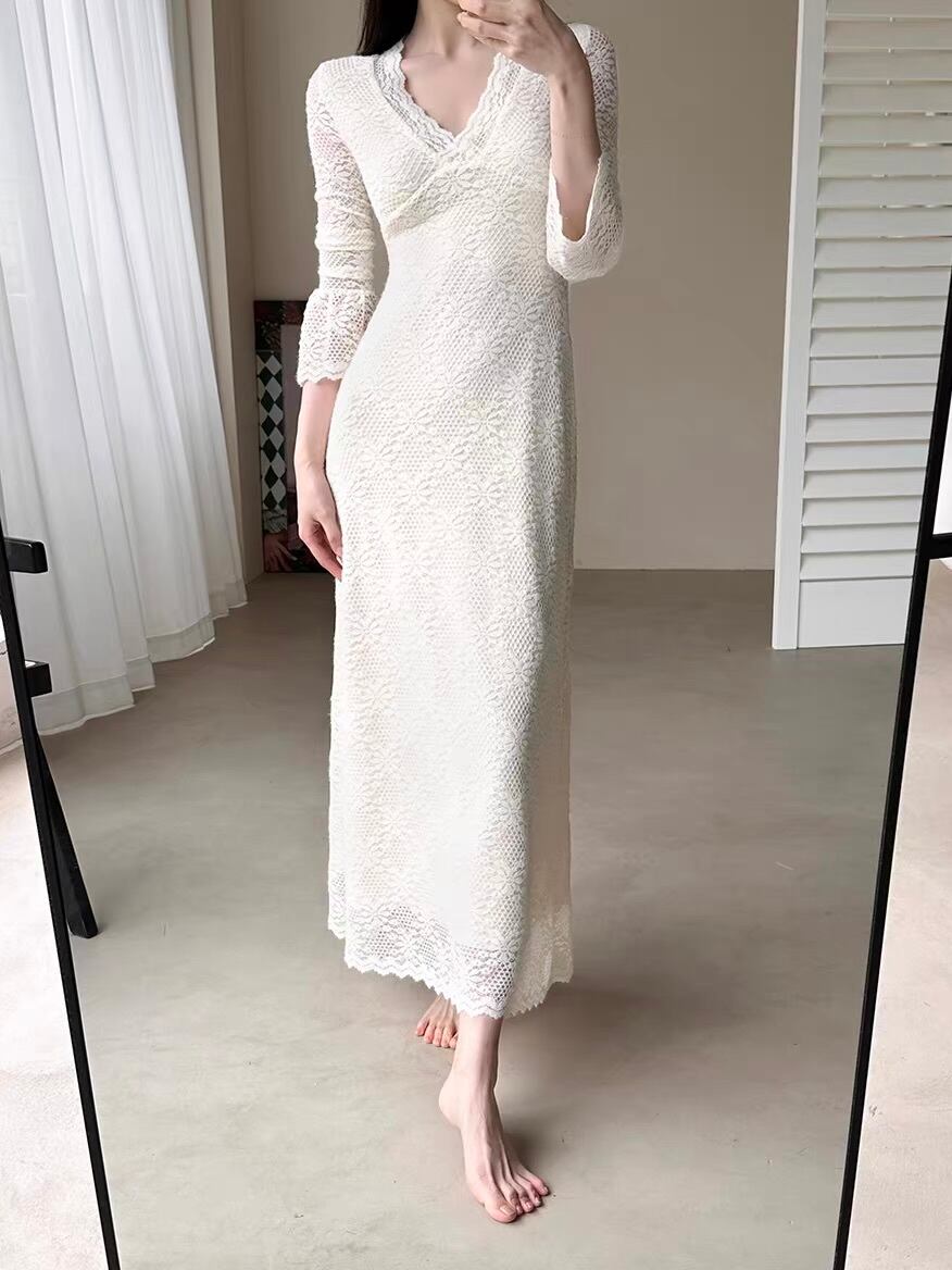 繊細な総レースが、静かな華やぎを纏わせる一着。 女性らしさを極めた、美しいシルエットのロングワンピースです。 デコルテを優しく縁取るスカラップVネックが、上品な抜け感を演出。 胸元のクロスデザインが立体感を生み、自然なくびれラインへと導きます。身体に沿う美しいシルエットから裾へと穏やかに広がるラインは、歩くたびに優雅な余韻を残します。 甘さを抑えたアイボリートーンが、大人の女性にふさわしい落ち着きと品格を表現。透け感のあるレーススリーブが、軽やかさと洗練を両立させています。 特別な日のお食事会やパーティーシーンはもちろん、格式ある場にも馴染む佇まい。 控えめでありながら確かな存在感を放つ、タイムレスなエレガントドレスです。 size:S 着丈121.5cm バスト77cm 肩幅34cm 袖丈62cm size:M 着丈123.5cm バスト81cm 肩幅35cm 袖丈63cm size:L 着丈125.5cm バスト85cm 肩幅36cm 袖丈64cm 表地素材:ナイロン90% スパンデックス10% 裏地素材:ポリエステル90% スパンデックス10% ◾︎ 配送期間 約10〜21営業日お時間を頂戴しております。(土日・祝日を除く) ◾︎ 公式LINEお友達追加で¥1,000 OFFクーポンプレゼント https://lin.ee/F5Jw76G ◾︎ 必ず下記ページの「ご利用ガイド」をお読みの上 ご購入をお願いいたします。 https://riristore.official.ec/about