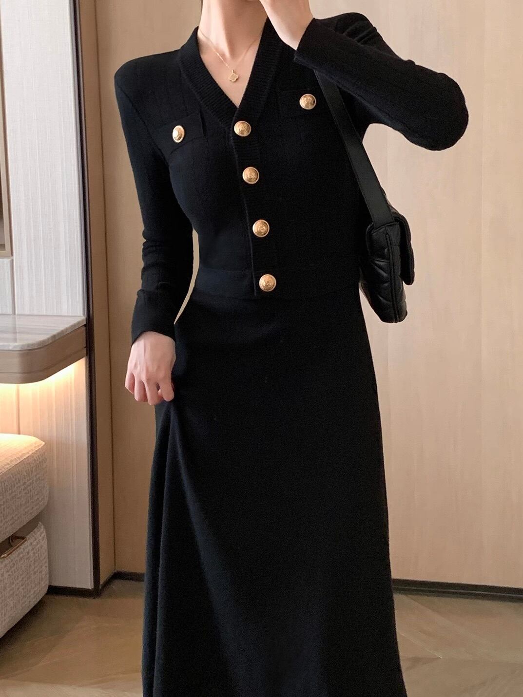 凛とした佇まいの中に、女性らしい柔らかさを秘めたニットドレス。 立体的な編地が美しくボディラインを包み込み、クラシカルなシルエットを描き出します。 胸元にあしらわれたゴールドボタンが、シックなブラックに華やぎを添え、 上品でありながらも印象に残るアクセントに。 軽やかに広がるフレアラインが、歩くたびに優雅な動きを演出し、 一枚で完成する洗練スタイルを叶えます。 落ち着いた雰囲気の中に確かな存在感を放つ、知的で上質な大人のための一着です。 size:S 着丈120cm バスト72cm 肩幅34cm 袖丈58cm size:M 着丈122cm バスト76cm 肩幅36cm 袖丈59cm size:L 着丈124cm バスト80cm 肩幅38cm 袖丈60cm 生地成分:ポリエステル54% アクリル20% ナイロン20% ウール6% ◾︎ 配送期間 約10〜21営業日お時間を頂戴しております。(土日・祝日を除く) ◾︎ 公式LINEお友達追加で¥1,000 OFFクーポンプレゼント https://lin.ee/F5Jw76G ◾︎ 必ず下記ページの「ご利用ガイド」をお読みの上 ご購入をお願いいたします。 https://riristore.official.ec/about
