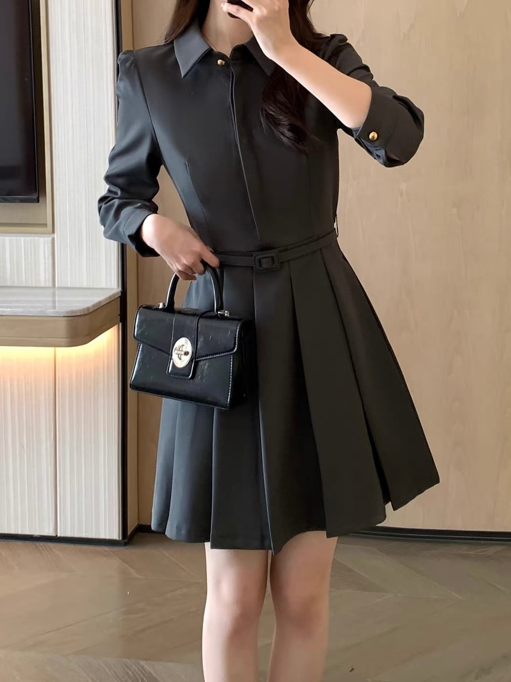 ウエストから広がる贅沢なプリーツは、歩くたびにドラマティックな表情を見せます。付属の共布ベルトがウエスト位置を高く見せ、程よいパフスリーブが肩周りを華奢に演出。大人の余裕を感じさせる、計算されたXラインを描きます。