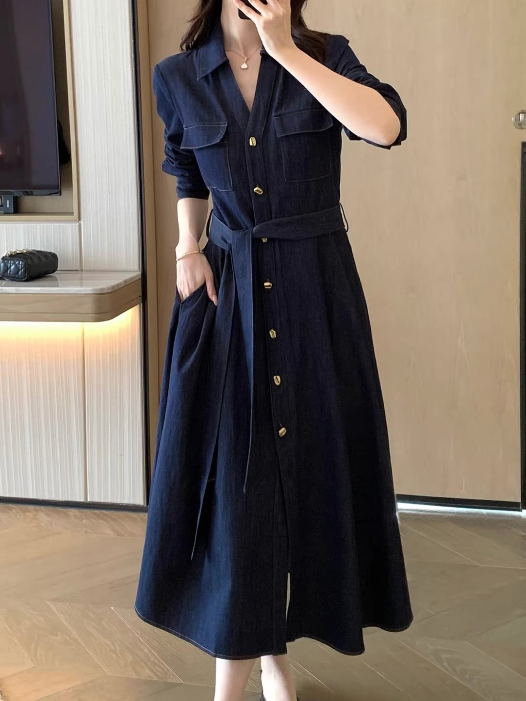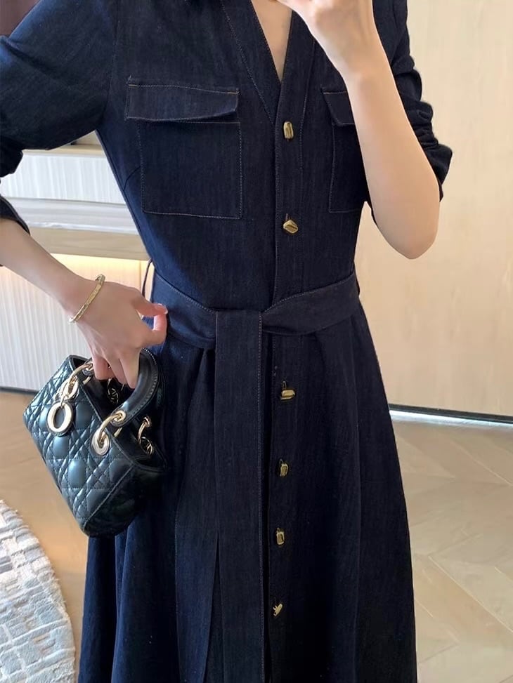 深みのあるインディゴブルーに、縦に並んだゴールドボタンがラグジュアリーなアクセントを添える、大人のためのデニムワンピースです。