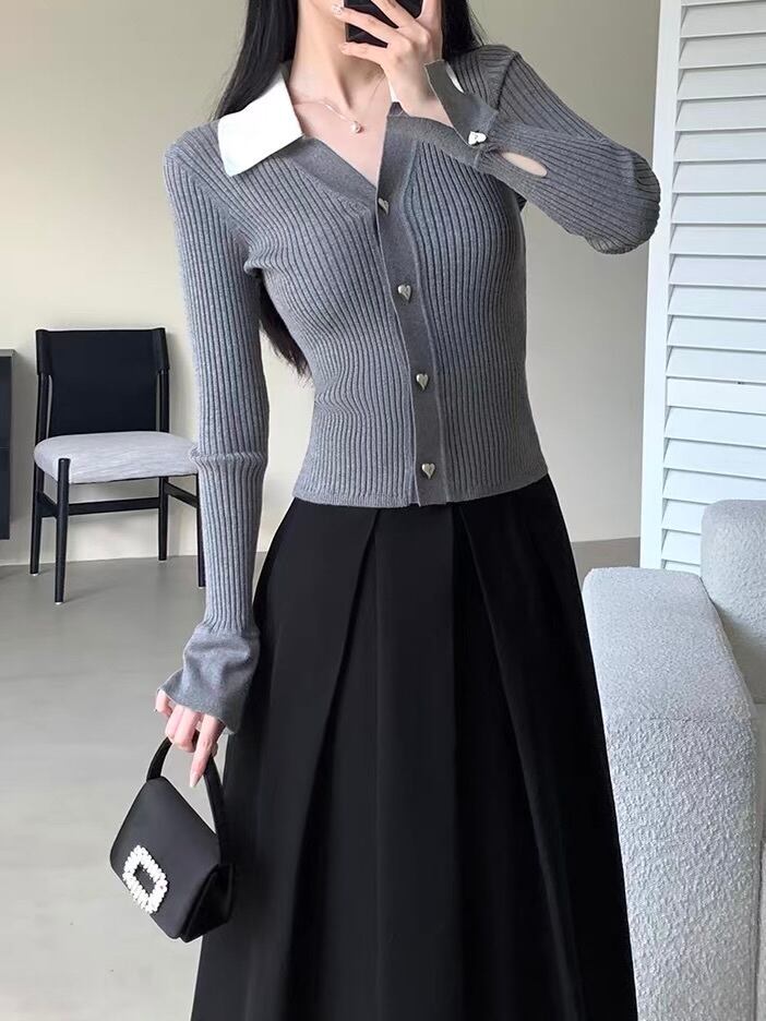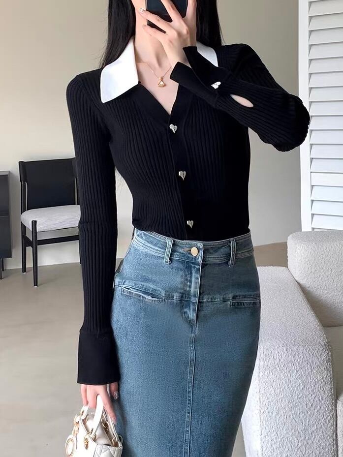 繊細なリブニットが描く美しいラインと、クラシカルな白襟のコントラスト。