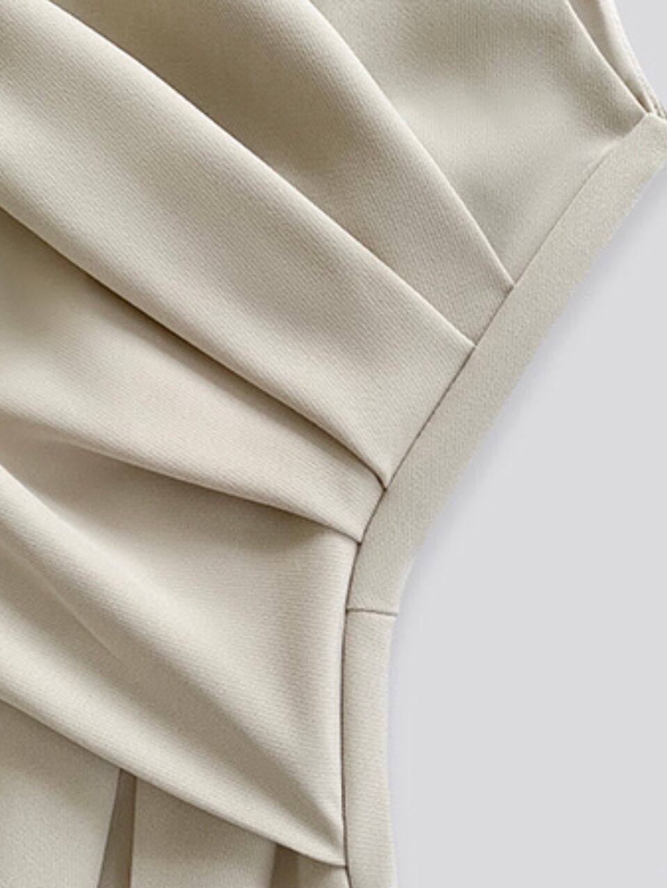 ウエストに施されたアシンメトリーなタックが、生地に深みのある表情を与えています。
