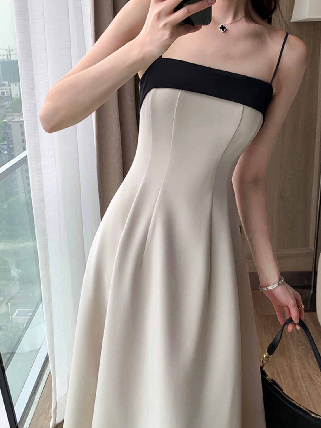無駄のないミニマルなシルエットに、バストラインのブラックカラーがアクセントとなった一着。