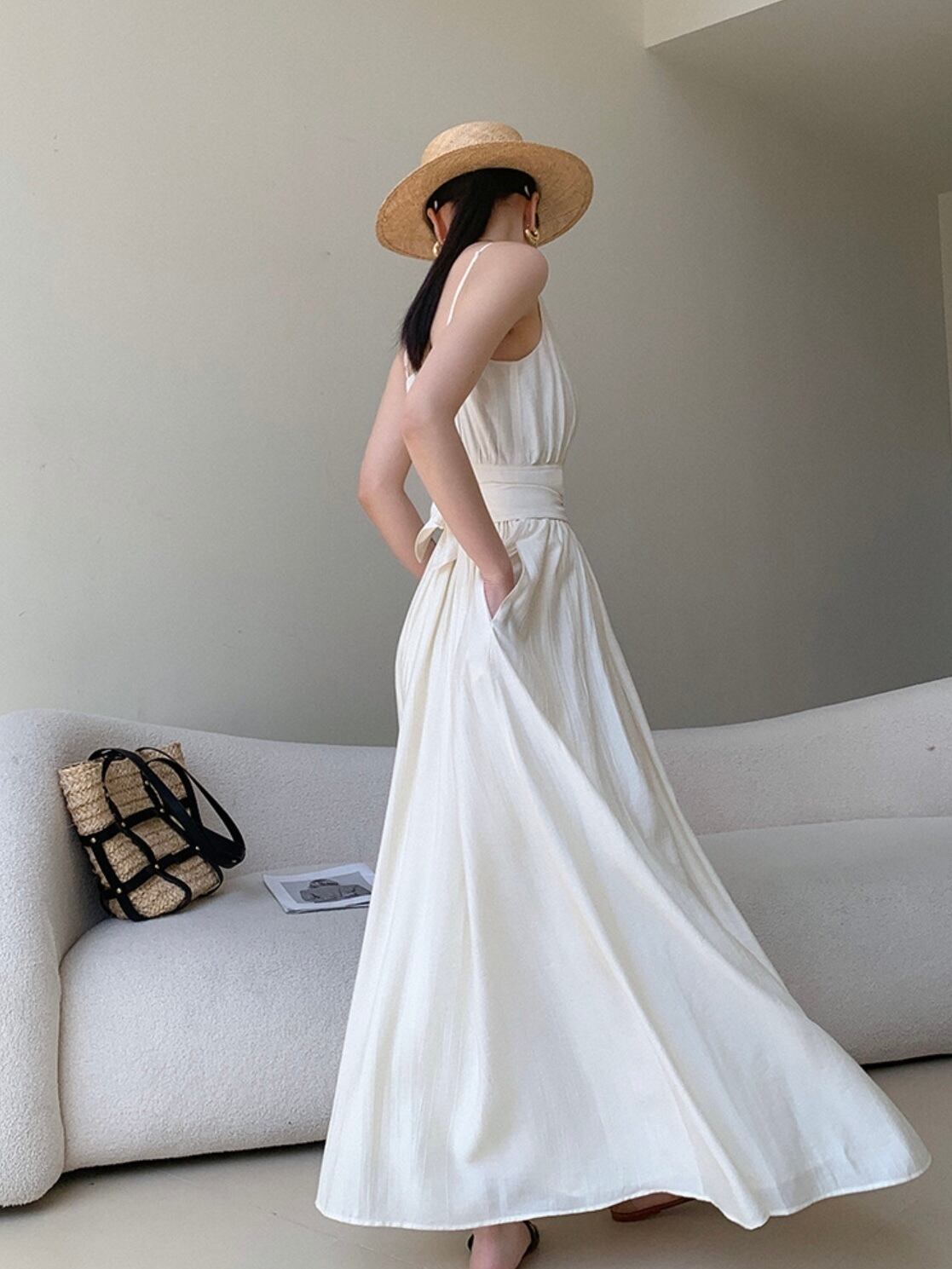 麦わら帽子やカゴバッグと合わせてリゾートスタイルに、シルバーアクセサリーで都会的に。休日のランチやバカンス、ちょっとしたお呼ばれにも映える一着です。