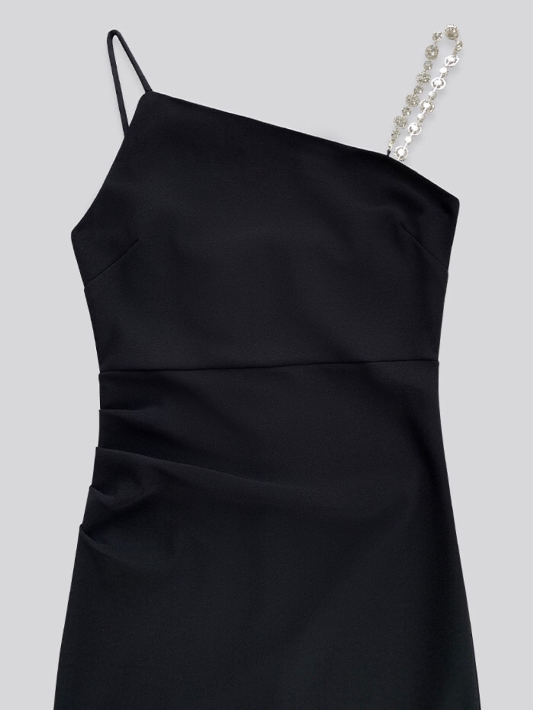 煌めくストラップとアシンメトリーなネックラインが、洗練された女性の美しさを引き立てるロングドレス。
