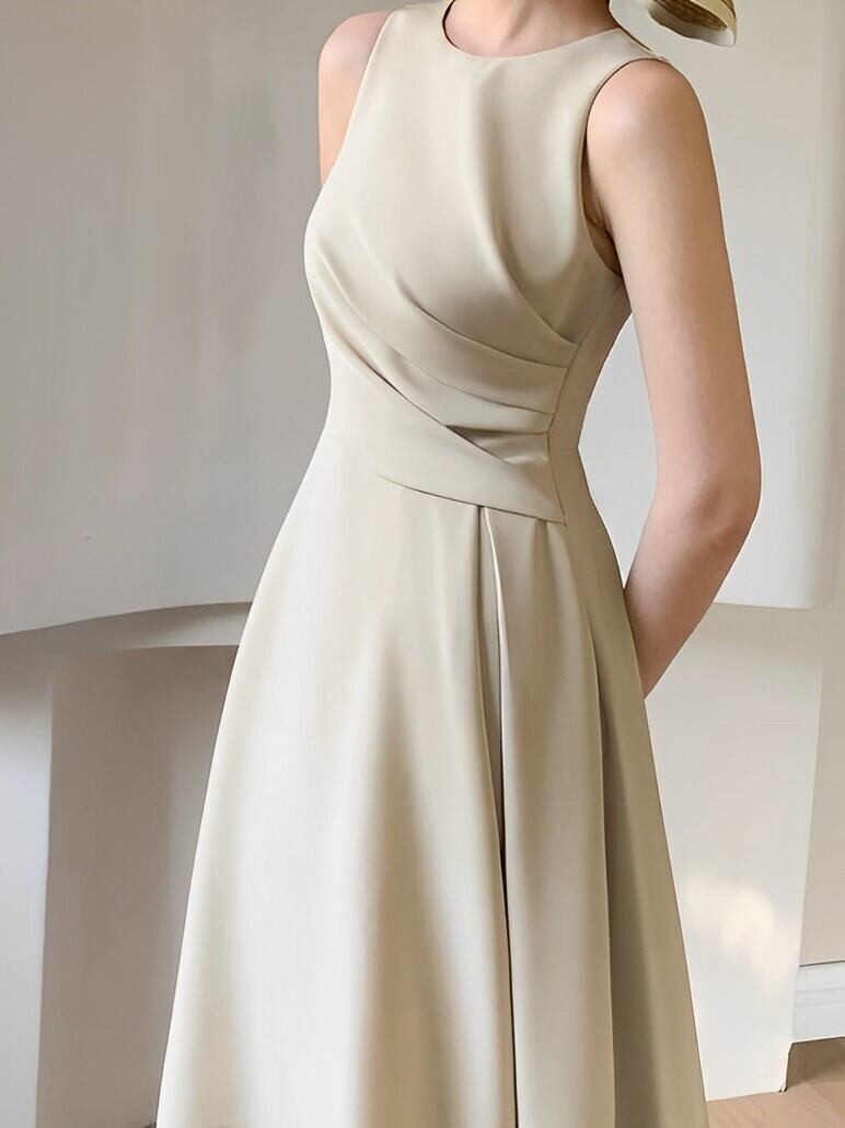 身体のラインに優しく沿うフィット&フレアのシルエットに、斜めに入ったタックが視線を引きつけるノースリーブワンピース。