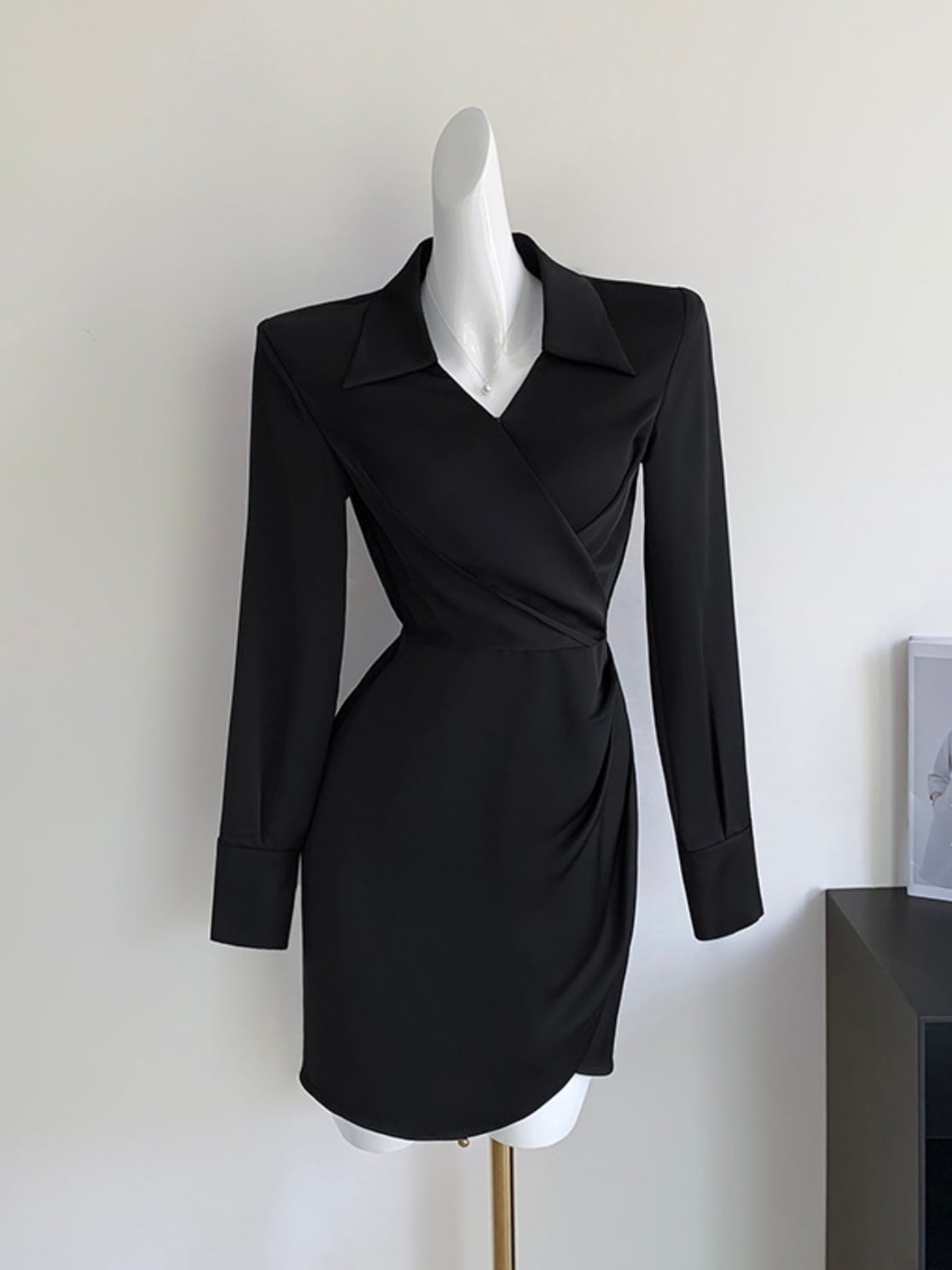 光沢感のあるサテン素材が、しなやかな動きに合わせて上質な輝きを纏うミニドレス。 端正なテーラードカラーと計算されたドレープデザインが織りなす立体的なフォルムは、洗練された存在感を放ちます。 ウエストを美しく際立たせ、優美でありながらもモードな印象を演出。 特別なシーンで気品と華やかさを纏う、大人の女性のための一着です。 size:S 着丈84cm バスト95cm 肩幅40cm 袖丈61cm size:M 着丈85.5cm バスト99cm 肩幅41cm 袖丈62cm size:L 着丈87cm バスト103cm 肩幅42cm 袖丈63cm ◾︎ 配送期間 約10〜21営業日お時間を頂戴しております。(土日・祝日を除く) ◾︎ 公式LINEお友達追加で¥1,000 OFFクーポンプレゼント https://lin.ee/F5Jw76G ◾︎ 必ず下記ページの「ご利用ガイド」をお読みの上 ご購入をお願いいたします。 https://riristore.official.ec/about